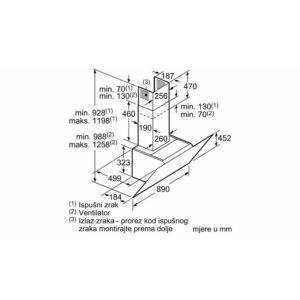 Dimenzije – odvod zraka (VxŠxG): 928-1198 x 890 x 499 mm